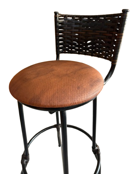 FICHA TÉCNICA Material da estrutura: Aço Tubular 3/4 Material do assento: Courino, espuma laminada Material do encosto: Junco Altura total: 94 cm Altura até assento: 74 cm Diâmetro do assento: 34x34cm Encosto: 33cm x 19cm Cor estrutura: Preto, epoxi Peso Máximo Recomendado: 120 kg