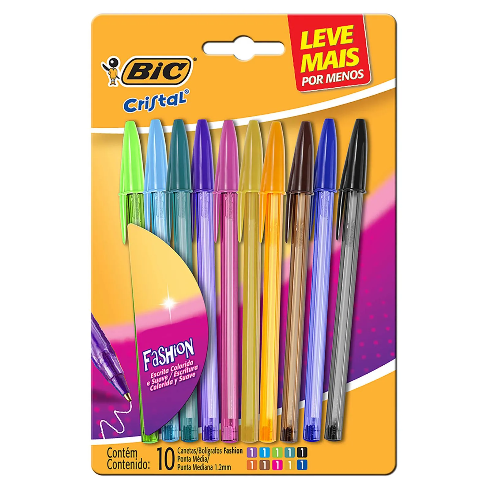 A Caneta Esferográfica BIC da linha Cristal Fashion possui escrita média e vem em uma cartela com 10 cores vivas como preto, azul, azul-turquesa, verde-claro, verde-escuro, roxa, rosa, laranja, dourado e marrom. Ideal para deixar as tarefas diárias mais leves e sua escrita mais colorida. Com a BIC você garante toda a qualidade necessária para realizar suas tarefas diárias e trabalhos impecáveis.